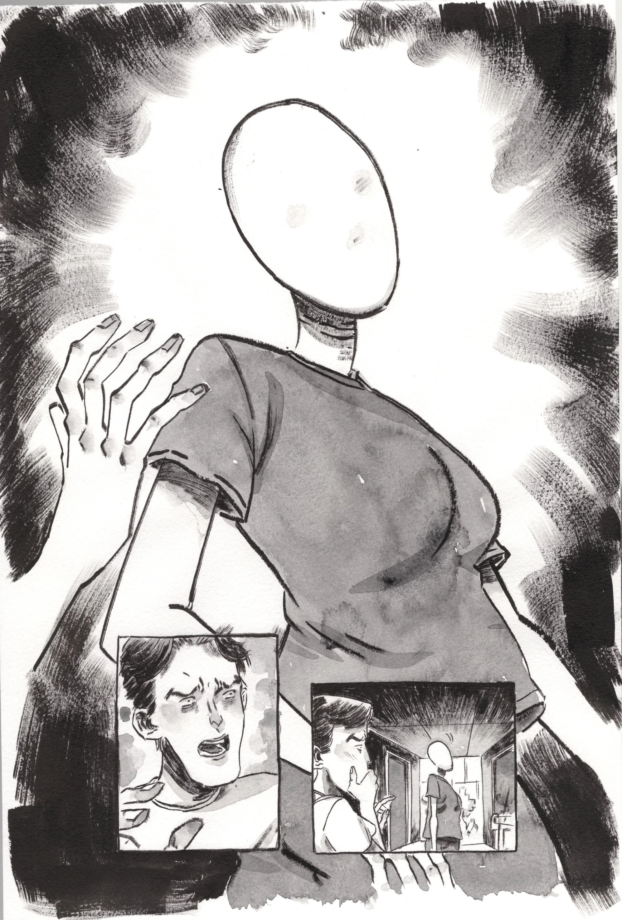 Pencils and inks on roughly-cut 9X14 Strathmore.